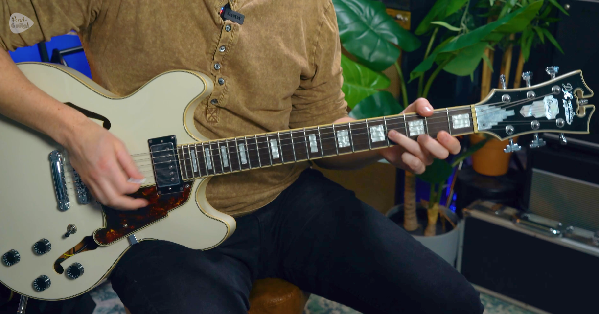 As soon as you add overdrive or distortion, any unmuted string will ring out sympathetically and create unwanted noise. To keep your legato playing clean, you’ll use the base of the thumb and the fleshy part of the picking hand to rest against the strings above the ones you’re playing. This is a habit to build now — it becomes non-negotiable as you progress into higher gain playing and faster legato passages.